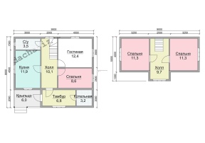 Общая площадь данной модели 88.8 кв.м., размер – 8х9 м.. В каждом помещении предполагается установка двойных окон размером 1х1,2м и межкомнатных филенчатых дверей. Полы дома – двойные с прослойкой утеплителя (URSA/ISOVER) и гидроизолятора (ондутис R70). Конструкцию завершает двускатная крыша, выполненная из ондулина (возможен выбор цвета).