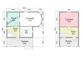 Общая площадь данной модели 58.5 кв.м., размер – 8х8 м.. В каждом помещении предполагается установка двойных окон размером 1х1,2м и межкомнатных филенчатых дверей. Полы дома – двойные с прослойкой утеплителя (URSA/ISOVER) и гидроизолятора (ондутис R70). Конструкцию завершает двускатная крыша, выполненная из ондулина (возможен выбор цвета).