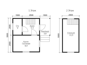 Общая площадь данной модели 29.79 кв.м., размер – 5х4 м.. В каждом помещении предполагается установка двойных окон размером 1х1,2м и межкомнатных филенчатых дверей. Полы дома – двойные с прослойкой утеплителя (URSA/ISOVER) и гидроизолятора (ондутис R70). Конструкцию завершает двускатная крыша, выполненная из ондулина (возможен выбор цвета).