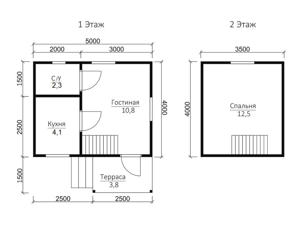Общая площадь данной модели 31 кв.м., размер – 5х4 м.. В каждом помещении предполагается установка двойных окон размером 1х1,2м и межкомнатных филенчатых дверей. Полы дома – двойные с прослойкой утеплителя (URSA/ISOVER) и гидроизолятора (ондутис R70). Конструкцию завершает двускатная крыша, выполненная из ондулина (возможен выбор цвета).