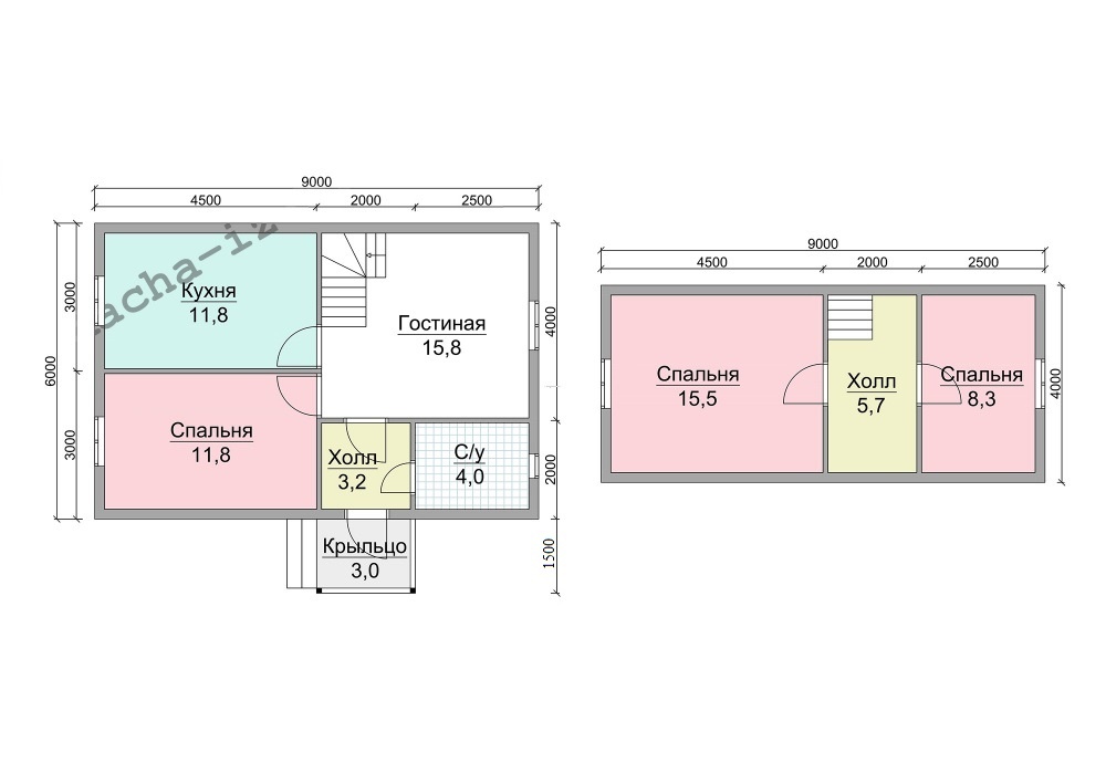 Общая площадь данной модели 76.1 кв.м., размер – 6х9 м.. В каждом помещении предполагается установка двойных окон размером 1х1,2м и межкомнатных филенчатых дверей. Полы дома – двойные с прослойкой утеплителя (URSA/ISOVER) и гидроизолятора (ондутис R70). Конструкцию завершает двускатная крыша, выполненная из ондулина (возможен выбор цвета).