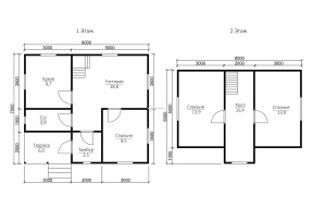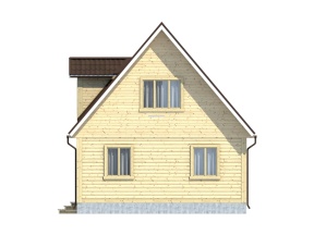 Общая площадь данной модели 98 кв.м., размер – 7х8 м.. В каждом помещении предполагается установка двойных окон размером 1х1,2м и межкомнатных филенчатых дверей. Полы дома – двойные с прослойкой утеплителя (URSA/ISOVER) и гидроизолятора (ондутис R70). Конструкцию завершает двускатная крыша, выполненная из ондулина (возможен выбор цвета).